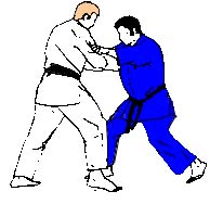 1 – Tori pousse le coude de uke vers l’intérieur pour le forcer à avancer sa jambe. Tori oriente simultanément son pied en cuillère.