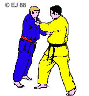 1 – Tori ouvre la manche vers le haut et l’avant (hikite et tsurite) pour obtenir un déséquilibre avant. Tori tient en garde croisée avec la main droite (pour les droitiers) au revers droit de uke avec les quatre doigts à l’intérieur.