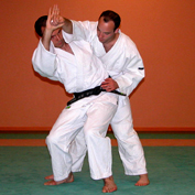 1 – Uke lance une attaque en oï-tsuki. Tori bloque par morote-teisho-uke. Il saisit le poignet de uke et le lève pour créer le déséquilibre avant.