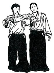 1 – Tori contrôle le poignet de uke par l’extérieur et effectue une action sur le coude de uke pour le forcer à avancer.