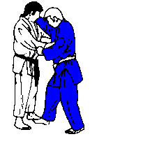 1 – Uke attaque tori par une technique avant. Tori bloque cette attaque en baissant ses appuis. Il bloque également uke en contrôlant le dos et la manche de uke.